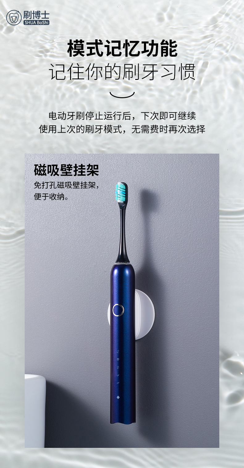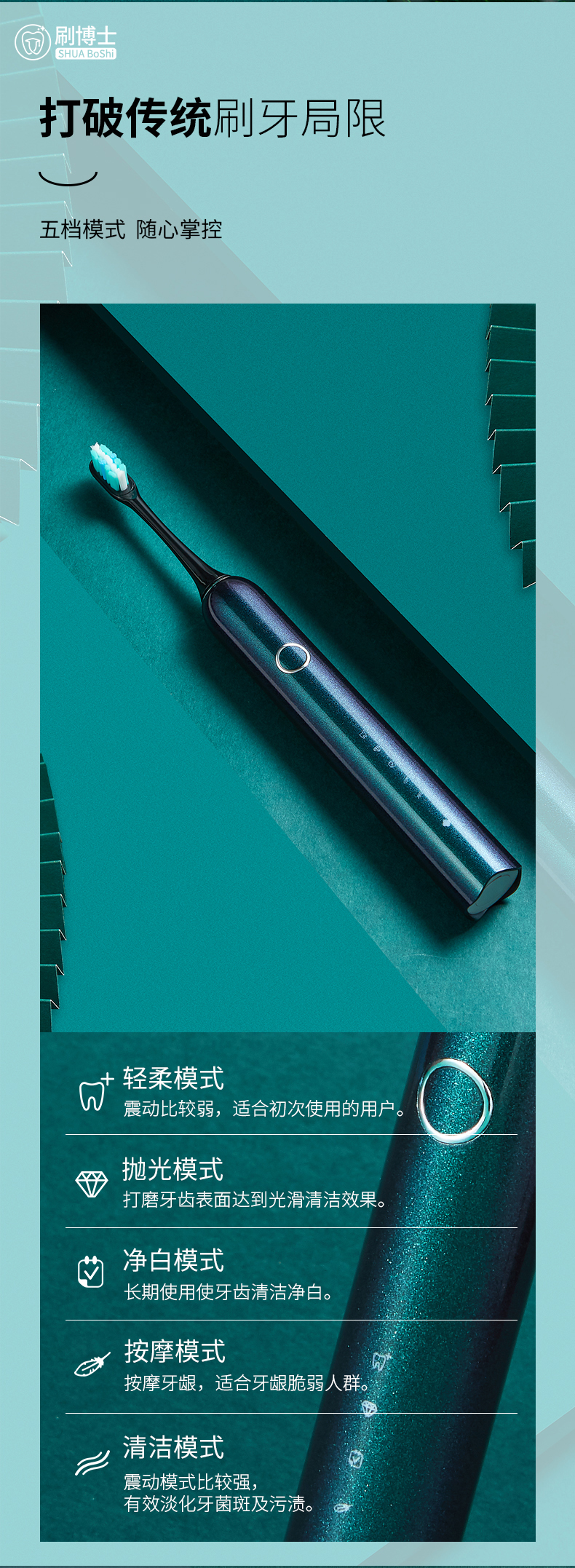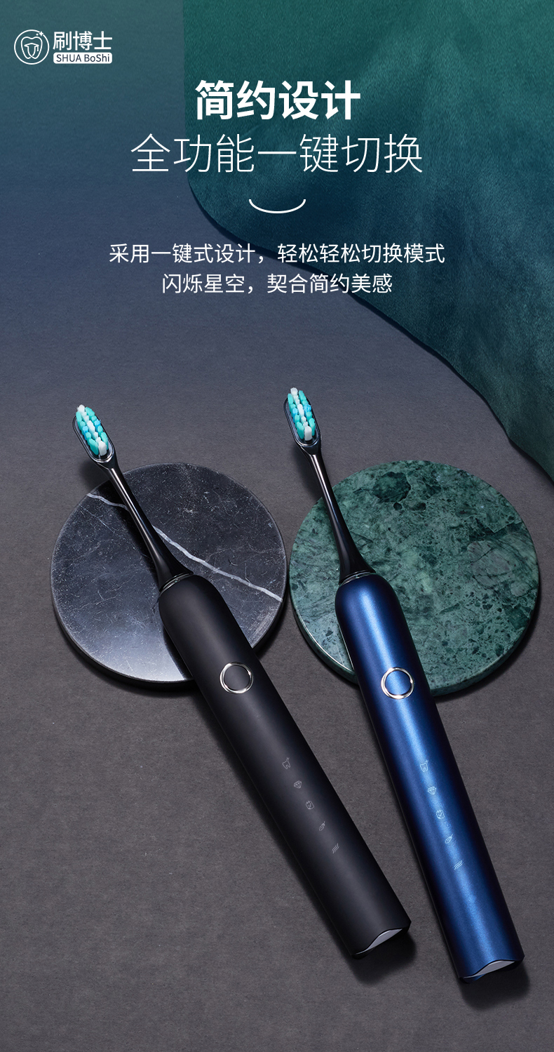 刷博士【S300智能聲波電動牙刷】是一款集潔齒、護理及體驗煥然一新于一身的多功能聲波電動牙刷,采用一鍵式的簡約設(shè)計,5檔清潔模式,隨心掌控;此外,植入了模式記憶功能,牢牢記住你的刷牙習慣,下次刷牙,無需費時再次選擇;強勁的續(xù)航功能,一年僅充1次電;高顏值的顏色設(shè)計,皓月白、睿智黑、深邃藍等多種顏色選擇,遇上不同風格的你。
