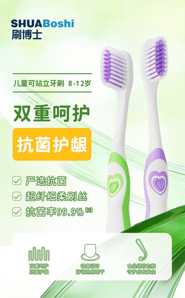 刷博士 B601 兒童可站立牙刷,采用抗菌軟毛 + 超纖細(xì)柔刷絲雙效設(shè)計(jì),高效清潔同時(shí)溫和護(hù)齦;99.9% 抗菌率認(rèn)證 + 食品級(jí)軟包膠,守護(hù)成長(zhǎng)更安心;間隔分布透氣刷面 + 吸盤(pán)式站立設(shè)計(jì),適配兒童口腔精準(zhǔn)呵護(hù);8-12 歲專屬款型,全方位守護(hù)孩子口腔健康。