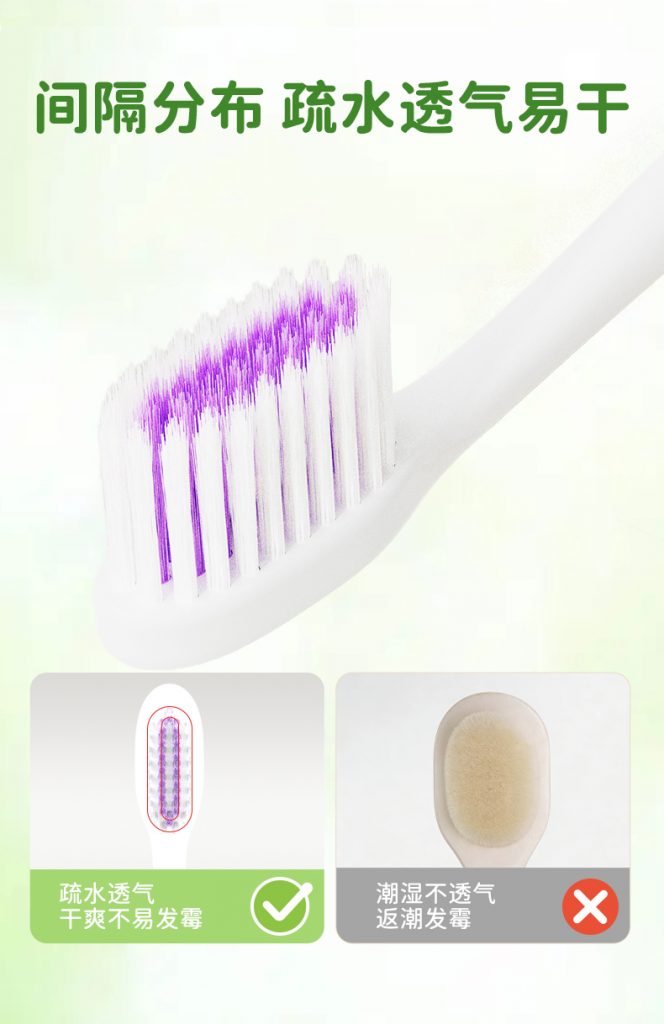 2、潔凈透氣:間隔分布疏水刷面,深入清潔齒縫,透氣易干,減少細(xì)菌滋生,告別返潮發(fā)霉。