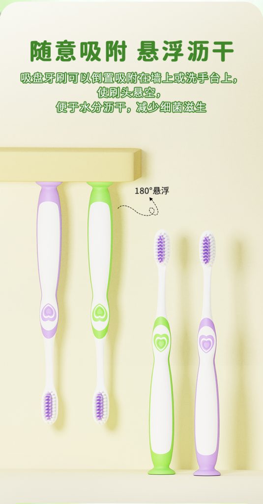 4、便捷收納:吸盤(pán)式站立設(shè)計(jì),可倒置吸附瀝水,刷頭懸空干爽,方便收納,培養(yǎng)孩子刷牙好習(xí)慣。
